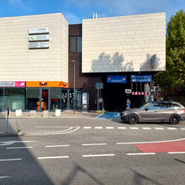 - Tiefgarage Postplatz im selben Gebäude mit Parkmöglichkeiten (je nach Verfügbarkeit). Alternative Parkmöglichkeiten sind direkt gegenüber das Parkhaus des Landratsamts und die Tiefgarage Querspange.
